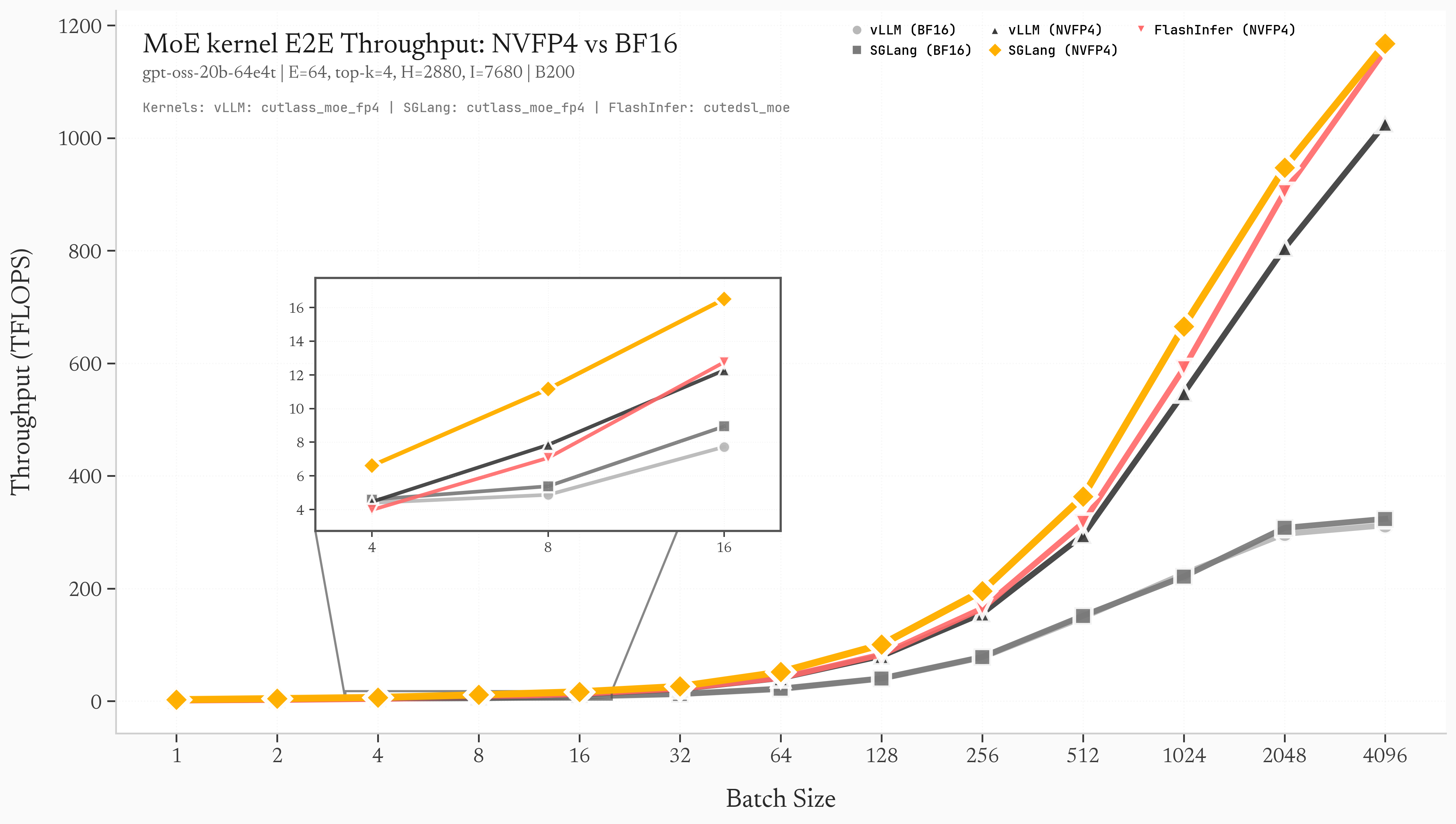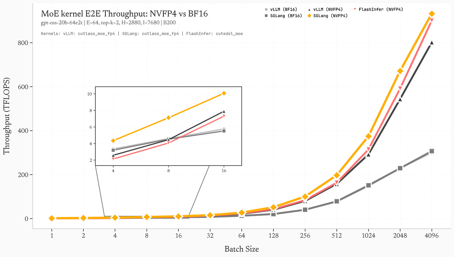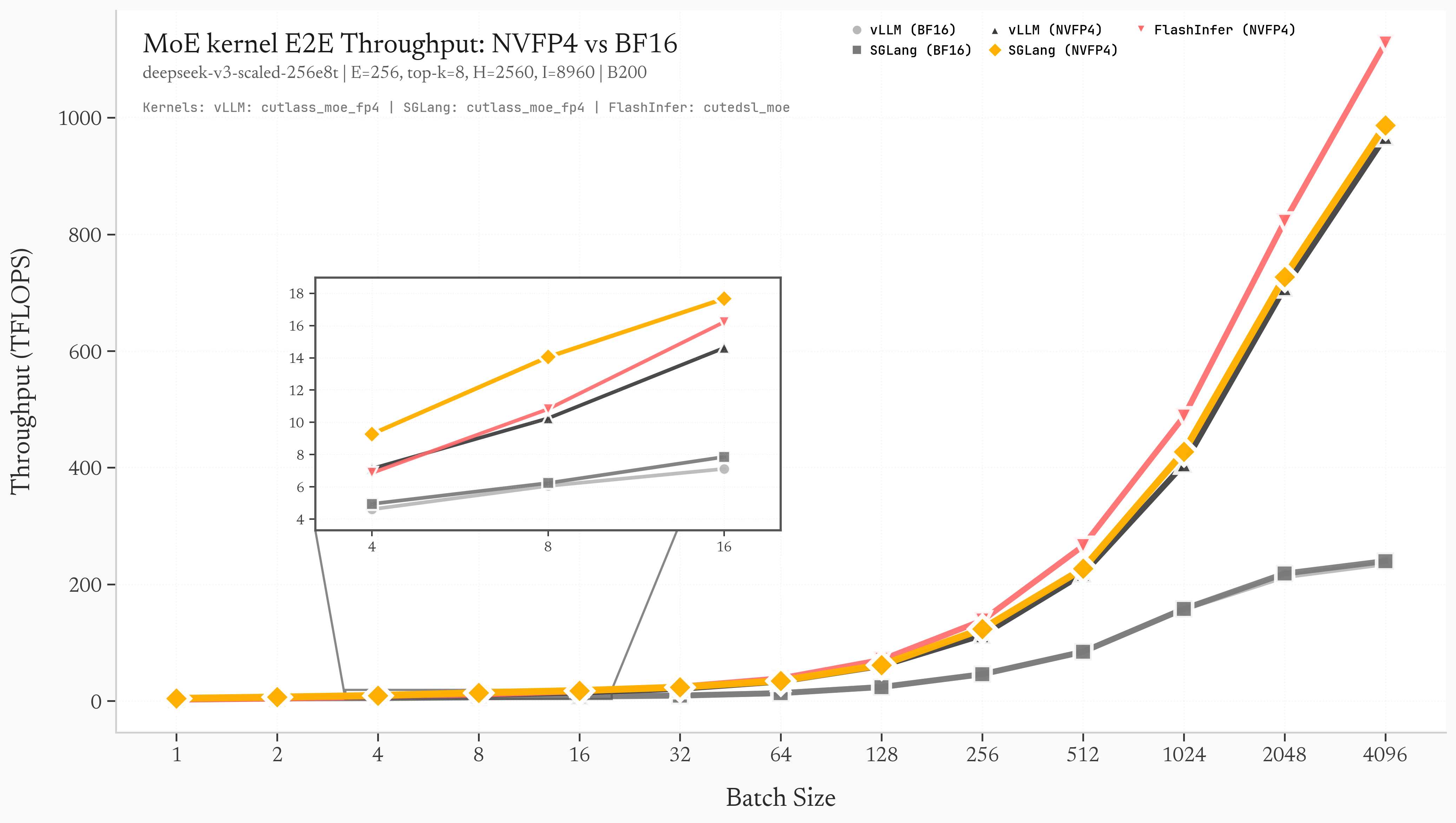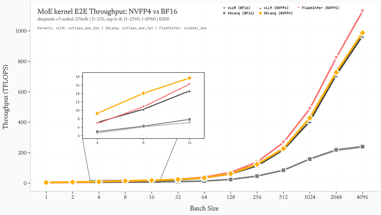 The results: - SGLang: 1168 TFLOPS peak throughput - vLLM: 1026 TFLOPS peak throughput - FlashInfer CuteDSL: 1156 TFLOPS peak throughput