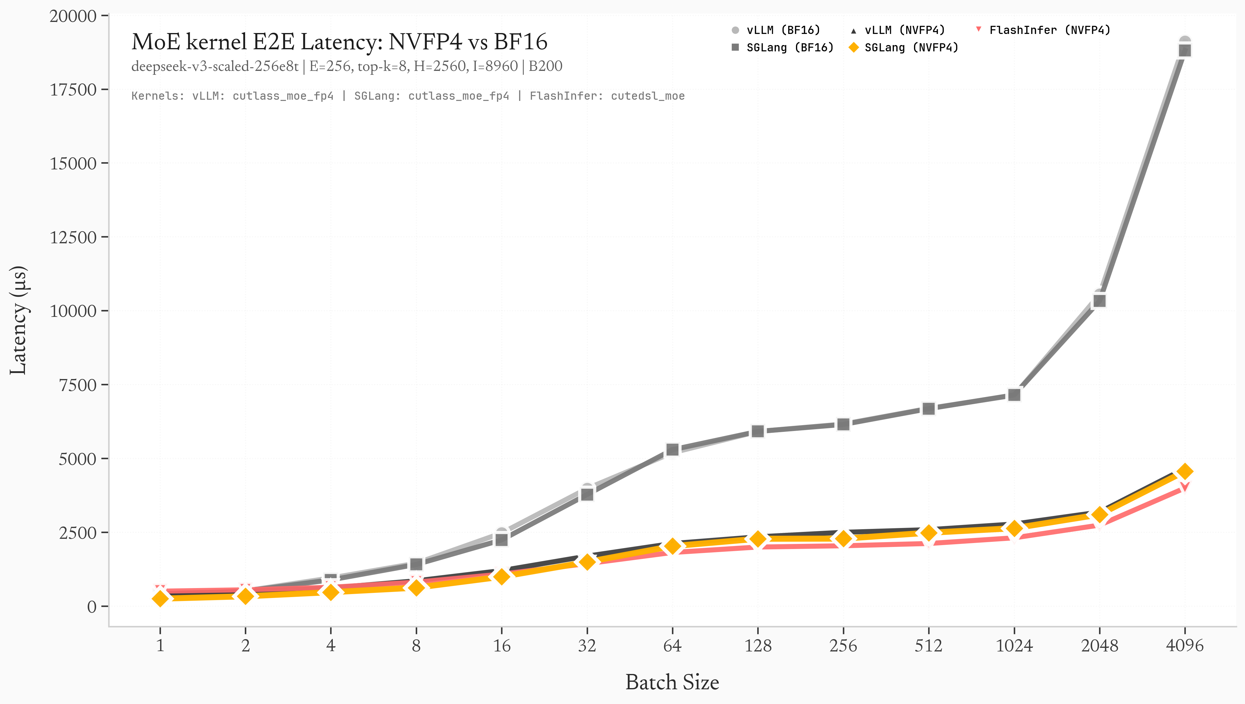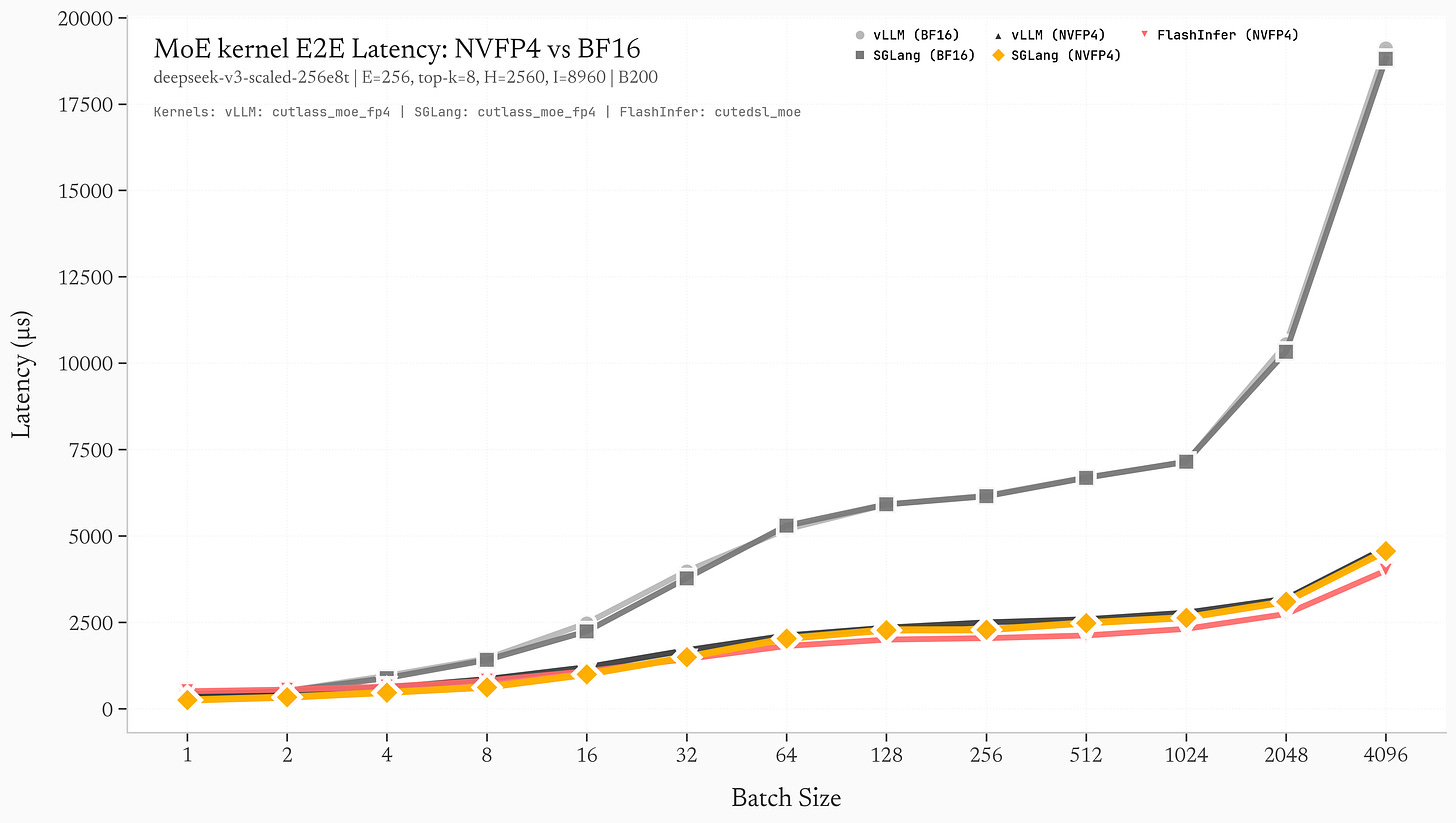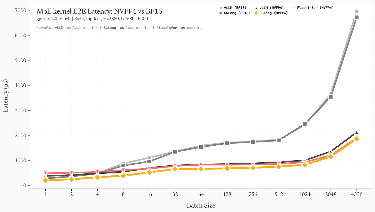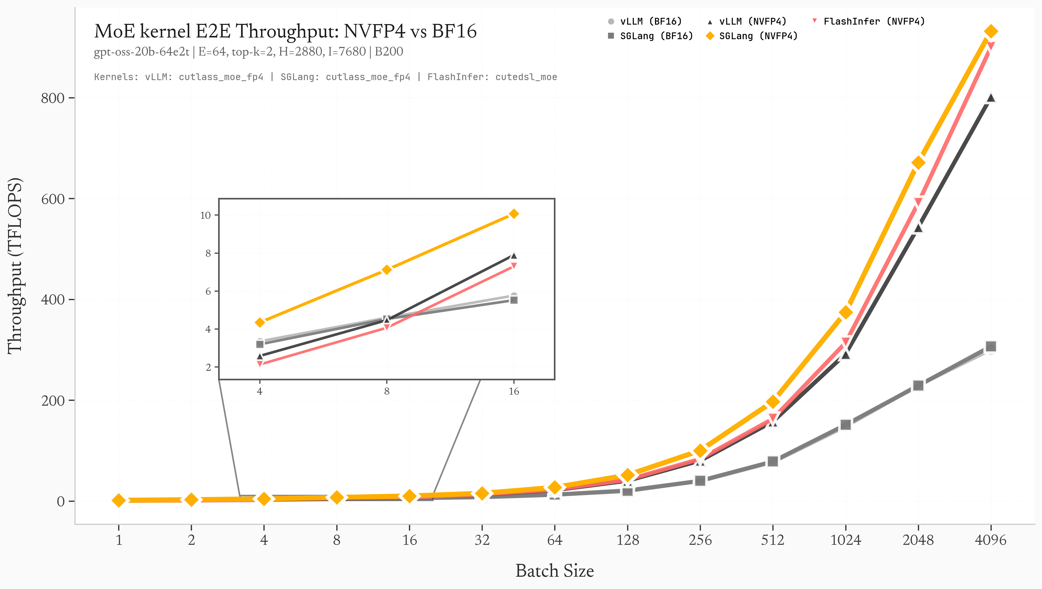 The results: - SGLang: 1168 TFLOPS peak throughput - vLLM: 1026 TFLOPS peak throughput - FlashInfer CuteDSL: 1156 TFLOPS peak throughput